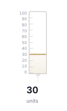An insulin syringe calibrated for 100 units per 1 mL. The standard syringe type used for peptide injections. 1 unit = 0.01 mL.